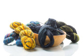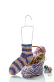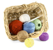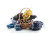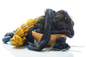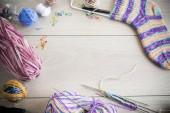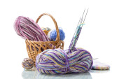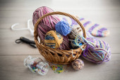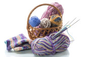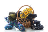 Colored threads, knitting needles and other items for hand knitting, isolated on a white background.