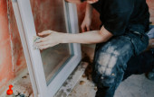 Biały mężczyzna myje ręce suchą papierową serwetką, używając noża do budowy w otworze ramy okna, widok z bliska, z wybiórczą ostrością. Koncepcja remontu domu, mycia ram okiennych.