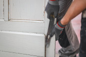 Zdjęcie "Biały mężczyzna myje ręce suchą papierową serwetką, używając noża do budowy w otworze ramy okna, widok z bliska, z wybiórczą ostrością. Koncepcja remontu domu, mycia ram okiennych." może być wykorzystywane do celów osobistych i komercyjnych zgodnie z warunkami zakupionej licencji Royalty-free. Obraz jest dostępny do pobrania w jakości wysokiej rozdzielczości do 5760x3840.