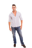 dorywczo młody człowiek w dżinsy i t-shirt. łapka na biały.