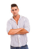 młody człowiek w dżinsy i koszulę. łapka na biały.