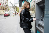 Młoda przemyślana brunetka dziewczyna wypłaca pieniądze z karty kredytowej w żółtym ATM.