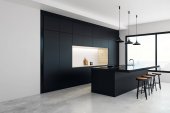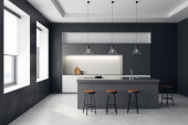 Wnętrze stylowej kuchni z szarymi ścianami, betonową podłogą, niebieskimi szafkami, ciemnodrewnianymi szafkami i niebieskim barem ze stołkami stojącymi w pobliżu panoramicznego okna. 3d renderowanie