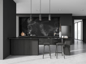 Zdjęcie "Wnętrze stylowej kuchni z szarymi ścianami, betonową podłogą, niebieskimi szafkami, ciemnodrewnianymi szafkami i niebieskim barem ze stołkami stojącymi w pobliżu panoramicznego okna. 3d renderowanie" może być wykorzystywane do celów osobistych i komercyjnych zgodnie z warunkami zakupionej licencji Royalty-free. Obraz jest dostępny do pobrania w jakości wysokiej rozdzielczości do 5760x3840.