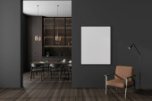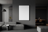 Wnętrze studia White Home z sofą i stołem na tle, dywan i stolik kawowy z książkami. Miejsce relaksu z makietą płóciennego plakatu. Renderowanie 3D