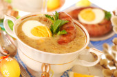 Wielkanoc biały barszcz i kiełbasa na wiejski Stół drewniany