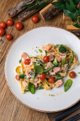pyszny makaron w talerzu na białym drewnianym stole. zbliżenie