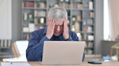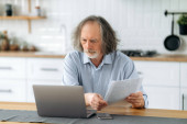 Zdezorientowany, dojrzały, siwy emeryt, siedzący przy stole w kuchni, zaskoczony, rozczarowany patrzeniem na ekran laptopa, zdenerwowany wiadomością, wiadomością lub rezultatem pracy