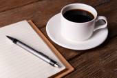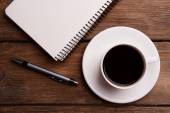 Filiżankę kawy na talerzyk z notebooka i łyżka na drewnianym stole tło