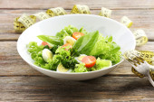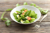 Sałatka z jajkiem przepiórczym i bazylii w płycie na tle rustykalnym drewniany stół