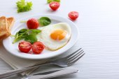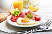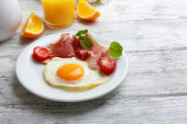 Zdjęcie "Bacon i jaj na kolor drewniany stół tło" może być wykorzystywane do celów osobistych i komercyjnych zgodnie z warunkami zakupionej licencji Royalty-free. Obraz jest dostępny do pobrania w jakości wysokiej rozdzielczości do 5760x3840.