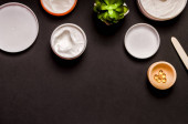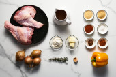 Klasyczny sos tatarski składniki na białym tle marmuru. Majonez z koperkiem i kaparami plus cytryna, cebula szalotkowa. Sos Worcester i musztarda Dijon. Najlepsze zdjęcie żywności widok. Płasko. Wysoka jakość