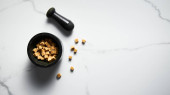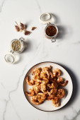 Klasyczny sos tatarski ze składnikami na ciemnym kamieniu lub marmurowym tle. Majonez z koperkiem i ogórkami marynowanymi z cytryną. Najlepsze zdjęcie żywności widok. FlatlayWysokiej jakości zdjęcie