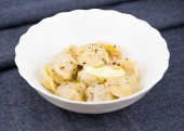 Świeże klopsiki morszczuka w sosie z białego wina. Tradycyjny hiszpański tapa przepis.
