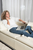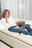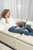 Zdjęcie "Kobieta z komputera na kanapie po telefon" może być wykorzystywane do celów osobistych i komercyjnych zgodnie z warunkami zakupionej licencji Royalty-free. Obraz jest dostępny do pobrania w jakości wysokiej rozdzielczości do 5760x3840.