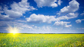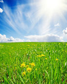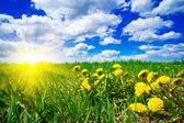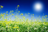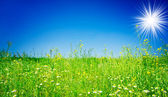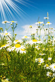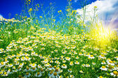 pole Camomiles przeciwko niebieski niebo i zabawy słońce.