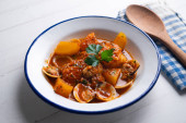 Zdjęcie "Pieczony dorsz gotowany z pomidorami i małżami. Tradycyjny hiszpański tapa przepis w Kraju Basków." może być wykorzystywane do celów osobistych i komercyjnych zgodnie z warunkami zakupionej licencji Royalty-free. Obraz jest dostępny do pobrania w jakości wysokiej rozdzielczości do 5760x3840.