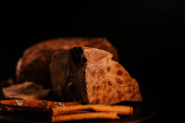 Czekoladowe. Kawałki ciemnej czekolady obracają się na ciemnym tle, obracają. Smakosz deser składnik. Wyroby cukiernicze, pojęcie słodyczy.