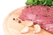 Surowy befsztyk z rozmarynem i czosnkiem na deska do krojenia na drewniane tła