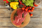 Surowy befsztyk na papierze z warzyw i zieleni na drewniane tła