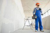 budowniczy na placu budowy z skrzynką narzędziową.