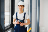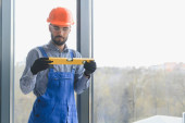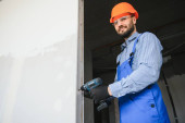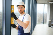 Robotnik w kombinezonach instalujący lub regulujący okna z tworzywa sztucznego w salonie w domu.