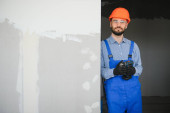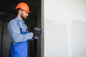 człowiek pracownik ściany gipsowo-kartonowej montaż blachy do ściany.