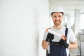 Portret młodego i pracowitego konstruktora pozującego w dużym niedokończonym pomieszczeniu. Koncepcja budynku.