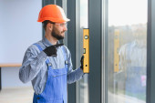 Robotnik w kombinezonach instalujący lub regulujący okna z tworzywa sztucznego w salonie w domu.