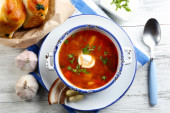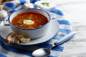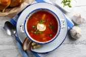 Ukraiński buraki zupa - barszcz, na niebieski serwetka, na tle drewniane