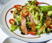 Sałatka łososiowa na kamiennym stole w znakomitej restauracji