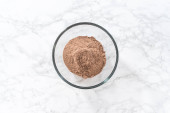 Leżeć płasko. Mieszanie suchych składników z ręczną trzepaczką w szklanej misce do mieszania do pieczenia orzechów makadamia białej czekolady.