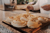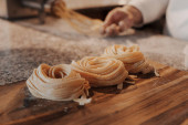 Bezimienna kucharka przygotowująca tradycyjny włoski makaron tagliatelle na marmurowym blacie w kuchni