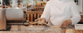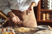 Bezimienna kucharka w białym fartuchu przygotowująca włoską tagliatelle z makaronem w kuchni restauracyjnej