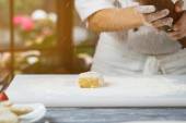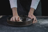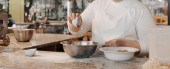 Bezimienna kucharka w białym fartuchu wylewa mąkę z gałki do metalowej miski podczas przygotowywania ciasta w kuchni