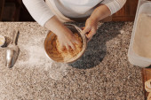 Bezimienna kucharka w białym mundurze ugniatająca ciasto piłka na marmurowym blacie w kuchni restauracyjnej