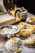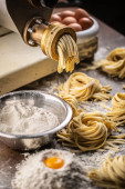 Wysoki kąt apetyczny ręcznie robione naturalne tagliatelle makarony rolki umieszczone na drewnianej desce do krojenia w kuchni