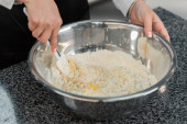 Upraw anonimowe kobieta gotować pękanie jaj do metalowej miski podczas przygotowywania ciasta na włoski makaron w kuchni