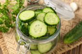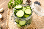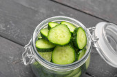 Słoik z kawałkami świeżego ogórka na ciemnym drewnianym tle
