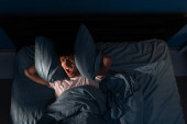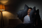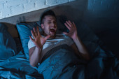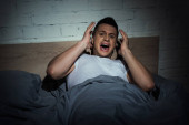 górny widok zestresowanego mężczyzny krzyczącego podczas nocnych koszmarów i ataków paniki