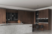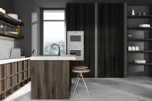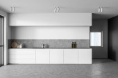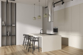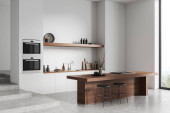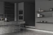 Zdjęcie "Widok rogu na jasne wnętrze kuchni z wyspy, stołki barowe, szafka, biała ściana, piekarnik, betonowa podłoga, naczynia, półki z naczyniami i książki. Koncepcja minimalistycznego designu. 3d renderowanie" może być wykorzystywane do celów osobistych i komercyjnych zgodnie z warunkami zakupionej licencji Royalty-free. Obraz jest dostępny do pobrania w jakości wysokiej rozdzielczości do 5760x3840.