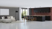 Widok rogu na jasne wnętrze kuchni z wyspy, stołki barowe, szafka, biała ściana, piekarnik, betonowa podłoga, naczynia, półki z naczyniami i książki. Koncepcja minimalistycznego designu. 3d renderowanie