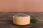 Nasiona szałwii w misce i łyżce na kolorowym tle. Zdrowa hispanika Salvia w małej misce. Zdrowa superżywność.