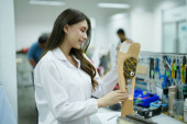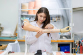 Technik ortopedyczny wykonujący protezę nóg dla osób niepełnosprawnych w warsztacie.