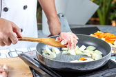 szef kuchni kładąc kawałek pf wieprzowina garnka do gotowania wieprzowiny japoński