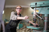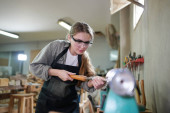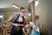 Zdjęcie "Młoda piękna kobieta pracuje w warsztatowej pracowni cieśli DIY. Właścicielka małej firmy, młoda kobieta pracująca w fabryce mebli." może być wykorzystywane do celów osobistych i komercyjnych zgodnie z warunkami zakupionej licencji Royalty-free. Obraz jest dostępny do pobrania w jakości wysokiej rozdzielczości do 5760x3840.