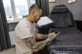 W salonie tatuażu. Azji młody człowiek stojący w salon tatuażu