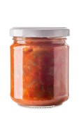 Sos pomidorowy bolognese w szklanym słoiku izolowane na białym ze ścieżką wycinania zawarte