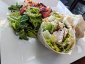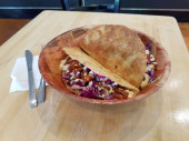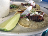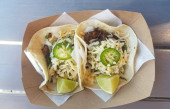 Pyszne i świeże danie rybne tacos, wykonane z mąki tortille, kapusta, wapna, paski kukurydzy, pico de gallo, i podpisu aioli. Tacos są wypełnione lokalnie przypalonym rzadkim tuńczykiem ahi, podawanym na białym talerzu.