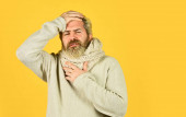 Starszy mężczyzna cierpiący na ból gardła na żółtym tle, zbliżenie. Przeziębienie